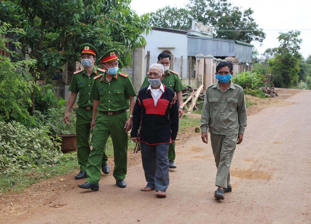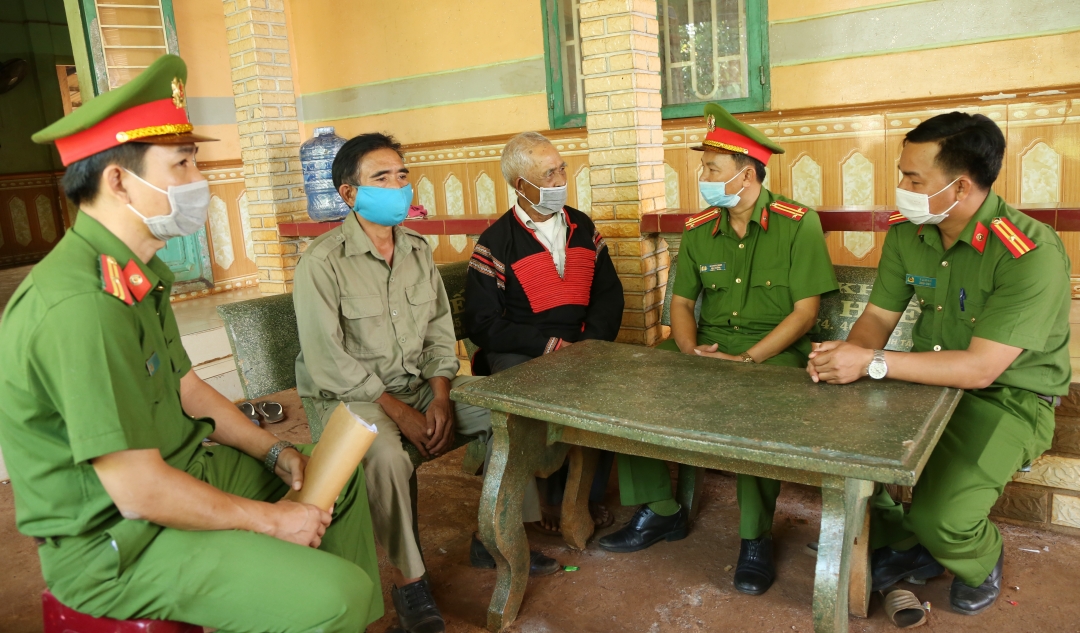 | Cán bộ Công an huyện Krông Năng phối hợp cùng già làng, người có uy tín tuyên truyền phòng, chống ma túy trong nhân dân. |