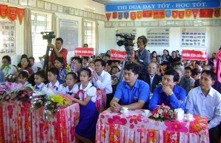 | Đại diện lãnh đạo Sở Giáo dục và Đào tạo và Tỉnh Đoàn tặng quà động viên các thí sinh Trường Tiểu học Nguyễn Công Trứ tại Vòng thi cấp Khu vực |