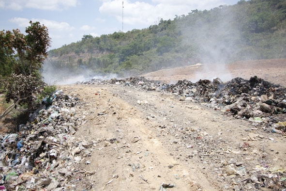 | Rác thải dọc lối đi lên bãi rác tập trung xã Ea Ô được đơn vị quản lý đốt, gây ô nhiễm khói, bụi và mùi hôi. |