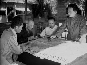| Đại tướng Võ Nguyên Giáp (người đứng) trình bày với Chủ tịch Hồ Chí Minh và các đồng chí lãnh đạo Đảng, Nhà nước kế hoạch mở chiến dịch Điện Biên Phủ năm 1954. |