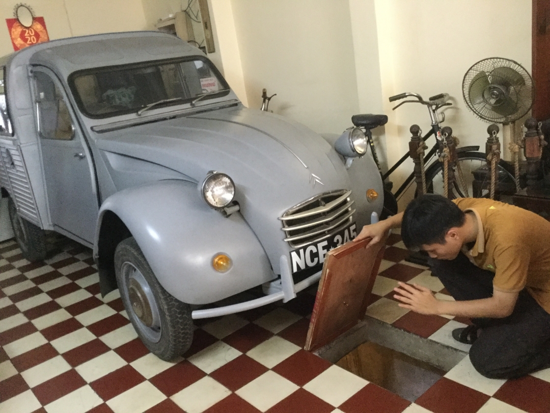| Chiếc xe tô chở vũ khí từ căn hầm tiến đánh Dinh Độc Lập và nắp hầm ngay trên nền nhà |