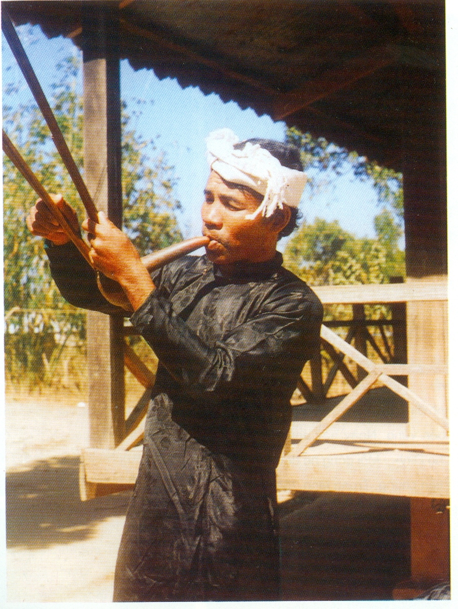 | Già làng M’nông thổi tù và làm bằng sừng trâu |