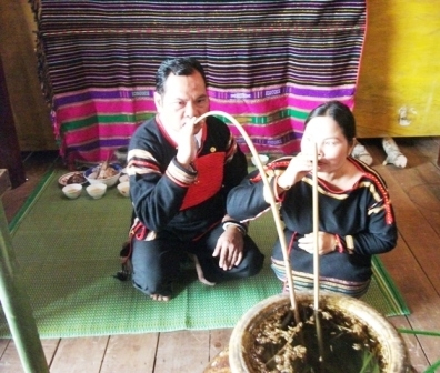 | Khi thầy cúng cúng khấn xong, cũng là lúc ché rượu được đổ đầy nước. Thầy cúng mời vợ chồng chủ nhà uống rượu khai ché, mở đầu cho tiệc rượu cần. |