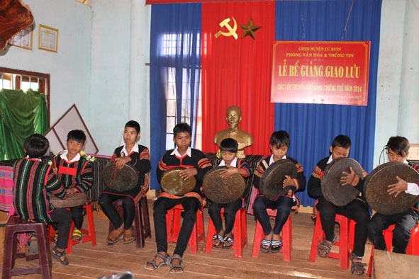 | Đội chiêng trẻ buôn Ea Ktur, xã Ea Ktur (huyện Cư Kuin) biểu diễn chiêng đồng. |