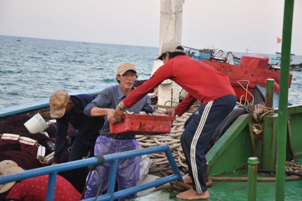 | Ngư dân chuyển cá từ tàu lên bờ. |