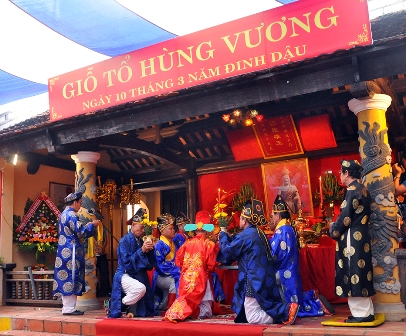 Đúng 9 giờ sáng ngày 10-3 âm lịch, trước bàn thờ Vua Hùng đặt tại Đình Lạc Giao, Chúc văn ghi ơn công đức Vua Hùng và các bậc tiền nhân được Nghệ sĩ Ưu tú Vũ Lân xướng lên trên nền nhạc tế lễ trang nghiêm và hùng tráng ngất trời.