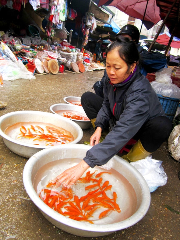 | Người dân bày bán cá chép đỏ tại chợ phiên. |