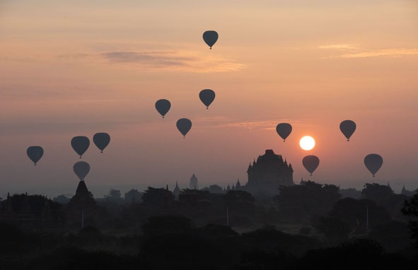 | Khinh khí cầu chở du khách ngắm cảnh bình minh ở Bagan. |