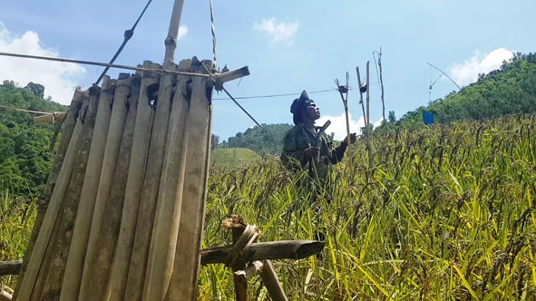 | Anh Y Niêm Niê (thị trấn Ea Đrăng, huyện Ea H’leo) kiểm tra bắp giống bảo quản theo cách truyền thống. |