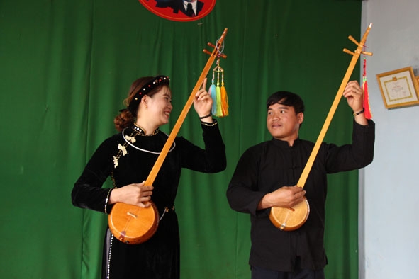 | Anh Nông Văn Tân cùng vợ trình diễn hát then, đàn tính. |