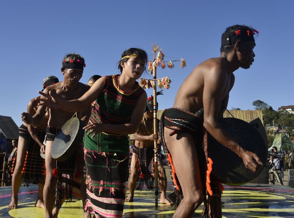 | Nam nữ M'nông trong điệu múa cồng chiêng. |