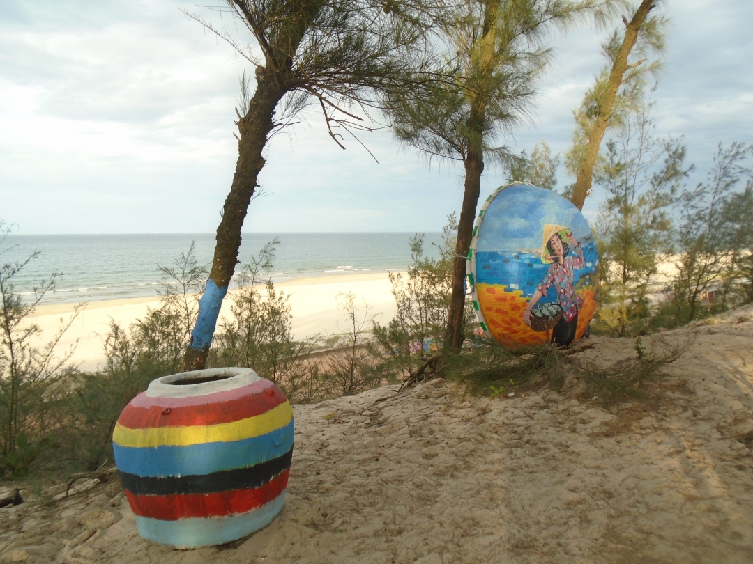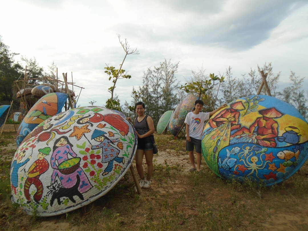 | Những chiếc thuyền thúng, chiếc lu được trang trí rực rỡ và sắp đặt khéo léo dưới gốc dương hướng ra biển |