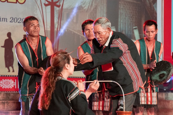 | Tái hiện các nghi thức trong lễ cưới của người M'nông Gar (huyện Lắk) tại Liên hoan. Ảnh: Hoàng Gia |