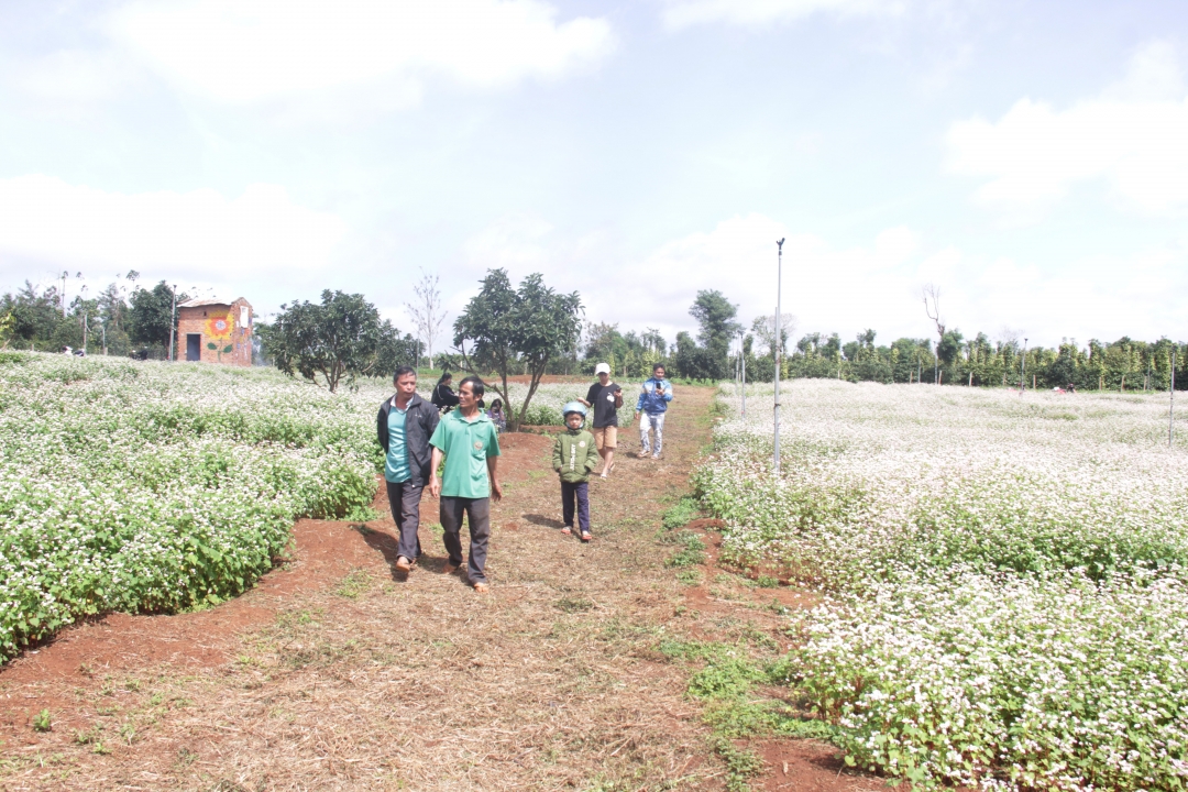 Cánh đồng tam giác mạch rộng chừng gần 2 ha nằm trên sườn dốc thoai thoải. Đang đầu mùa nên hoa có màu trắng hơi phớt tím. Mặc dù mới mở cửa được vài ngày, nhưng đã có nhiều người dân, đặc biệt là giới trẻ tìm đến checkin và ngỡ ngàng với đồng hoa tuyệt đẹp trên vùng đất đỏ. Anh Hoàng Anh Tuấn, chủ nhân của cánh đồng hoa cho biết, giống hoa anh đưa từ Hà Giang về trồng được hơn một tháng. Đang đầu mùa nên hoa còn nhạt, ít ngày nữa sẽ chuyển sang màu hồng tím thì đẹp rực rỡ hơn. Thời gian tới, anh sẽ tiếp thục mở rộng trồng tam giác mạch để hạn chế cỏ dại và tạo thêm những không gian đẹp tại địa phương.