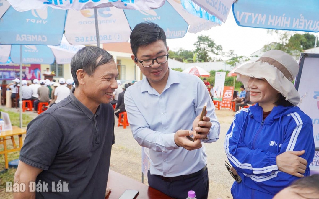 Cán bộ VNPT hướng dẫn người dân xã Cư Pơng sử dụng các ứng dụng số tại Lễ phát động Bình dân học vụ số. |