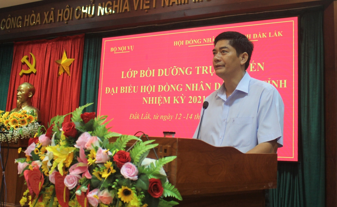 | Bí thư Huyện ủy, Chủ tịch HĐND huyện Krông Ana Nguyễn Kính phát biểu tại hội nghị. |