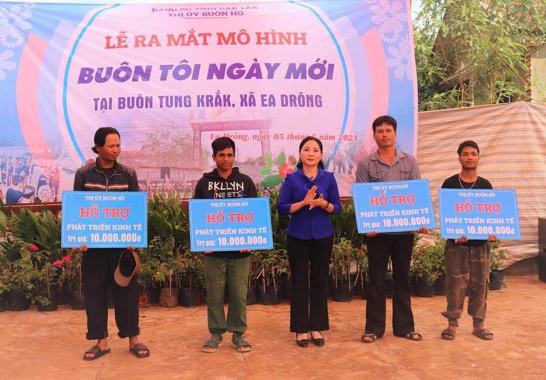| Thường trực Huyện ủy Krông Búk tặng hoa chúc mừng tân Chủ tịch HĐND huyện Trần Quốc Tuấn. |