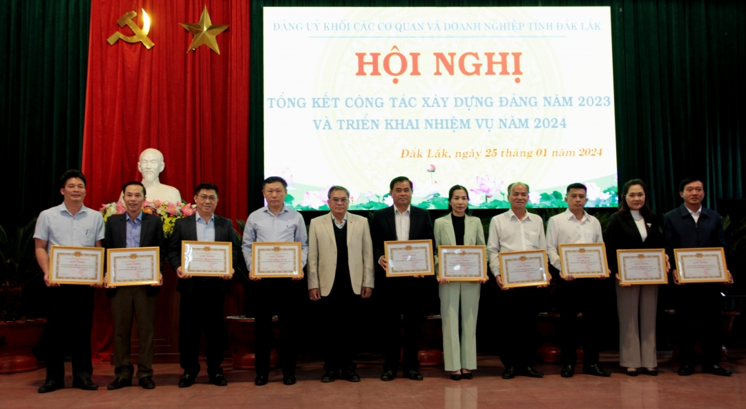| Phó Bí thư Huyện ủy, Chủ tịch UBND huyện Krông Năng Vũ Văn Mỹ trao Giấy khen của Chủ tịch UBND huyện tặng các tập thể. |