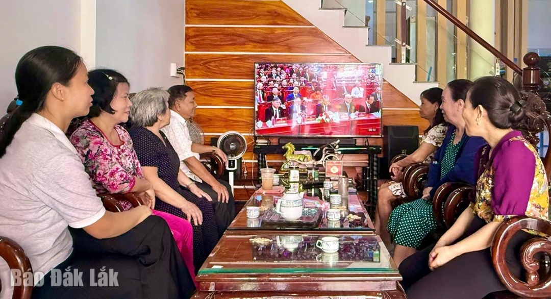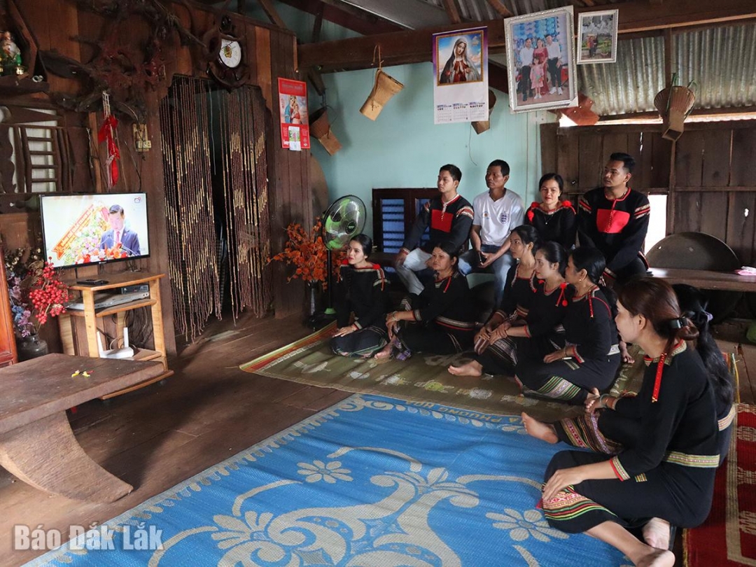 Mới 7 giờ sáng 30/9, đông đảo bà con, đảng viên buôn Ea Bông (phường Buôn Ma Thuột) quây quần trước màn hình ti vi tại ngôi nhà sàn của Trưởng buôn để theo dõi chương trình truyền hình trực tiếp lễ khai mạc Đại hội đại biểu Đảng bộ tỉnh Đắk Lắk lần thứ I.