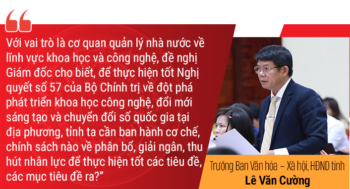 Trên cơ sở đó, đại biểu đề nghị Giám đốc Sở Khoa học và Công nghệ làm rõ: Để thực hiện tốt Nghị quyết số 57 tại địa phương, tỉnh cần ban hành những cơ chế, chính sách nào về phân bổ, giải ngân và thu hút nhân lực nhằm thực hiện các chỉ tiêu, mục tiêu đã đề ra.