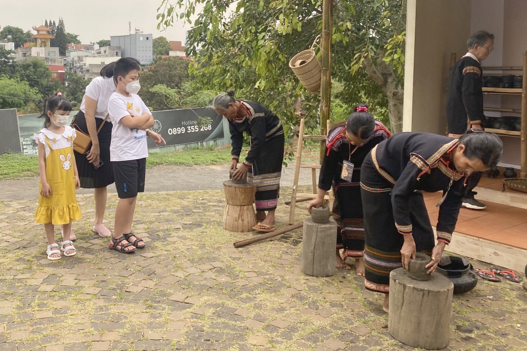 | Du khách tìm hiểu về cây ca cao tại Công ty TNHH Ca cao Nam Trường sơn (thôn Tân Tiến, xã Ea Na, huyện Krông Ana). |