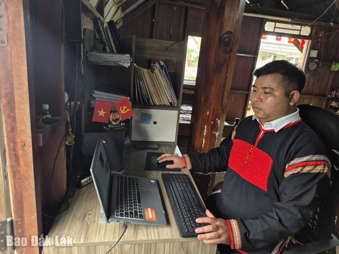 | Thầy Y Bế Kuan, giáo viên Trường THCS Hùng Vương (xã Hòa Sơn) nghiên cứu bài giảng tại nhà. |