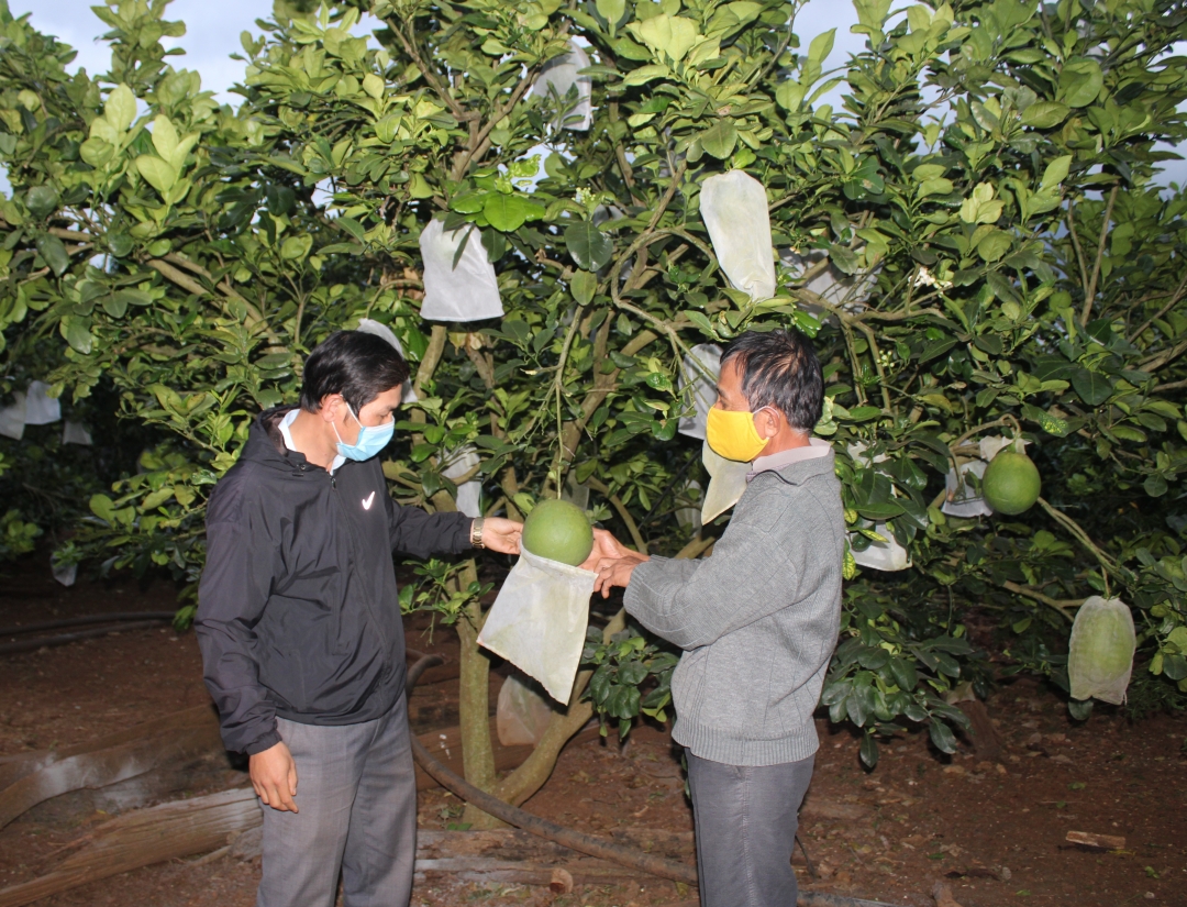 | Anh Nguyễn Văn Hải (bên trái) hướng dẫn kỹ thuật chăm sóc cây vải cho người dân xã Ea Yiêng. |