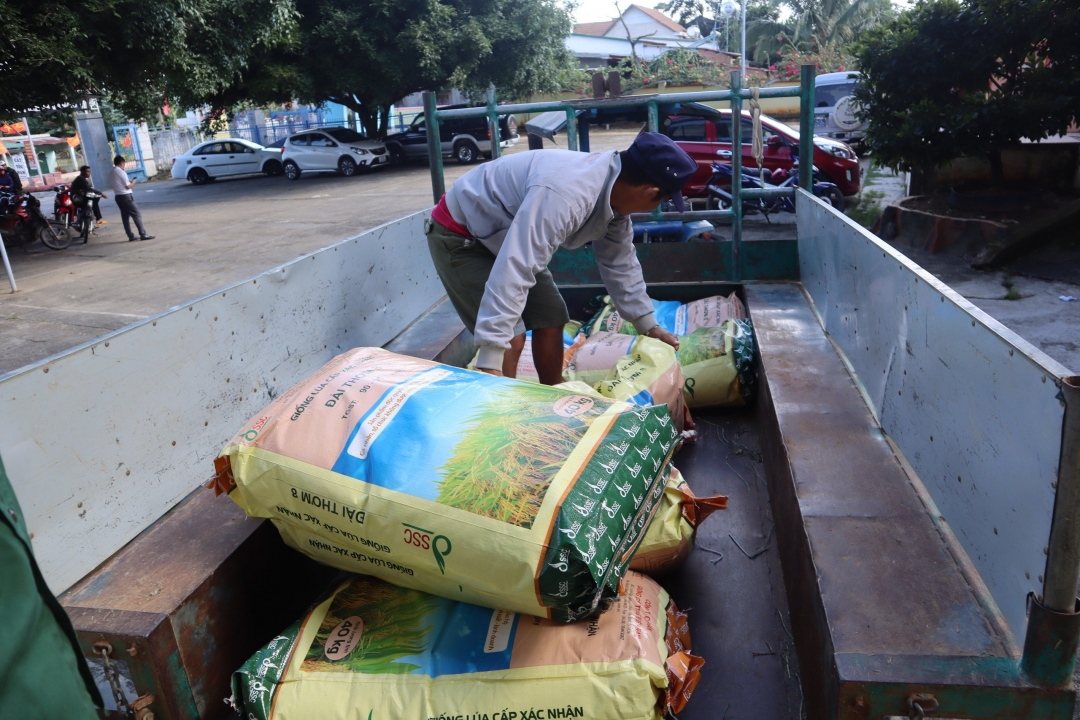 | Khách hàng tham quan, tìm hiểu sản phẩm gạo của Hợp tác xã Dịch vụ tổng hợp nông nghiệp Thăng Bình. Ảnh: Đinh Nga |