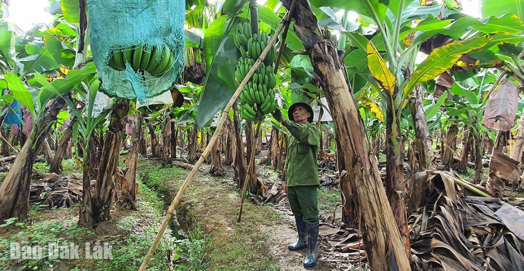 Trước đây, gia đình anh Trần Thế Tiền (buôn Mnăng Tar) trồng cà phê nhưng năng suất thấp do không có thời gian chăm sóc. Cách đây 5 năm, anh quyết định chuyển toàn bộ 1 ha cà phê sang trồng chuối tiêu hồng. Nhờ đất tốt, kỹ thuật phù hợp, chuối phát triển nhanh, tỉ lệ cây sống cao. “Năm đầu sau khi trừ chi phí, tôi lãi hơn 60 triệu đồng. Đến nay, mỗi năm thu nhập tăng gấp đôi, đạt khoảng 140 triệu đồng” - anh Tiền phấn khởi nói.