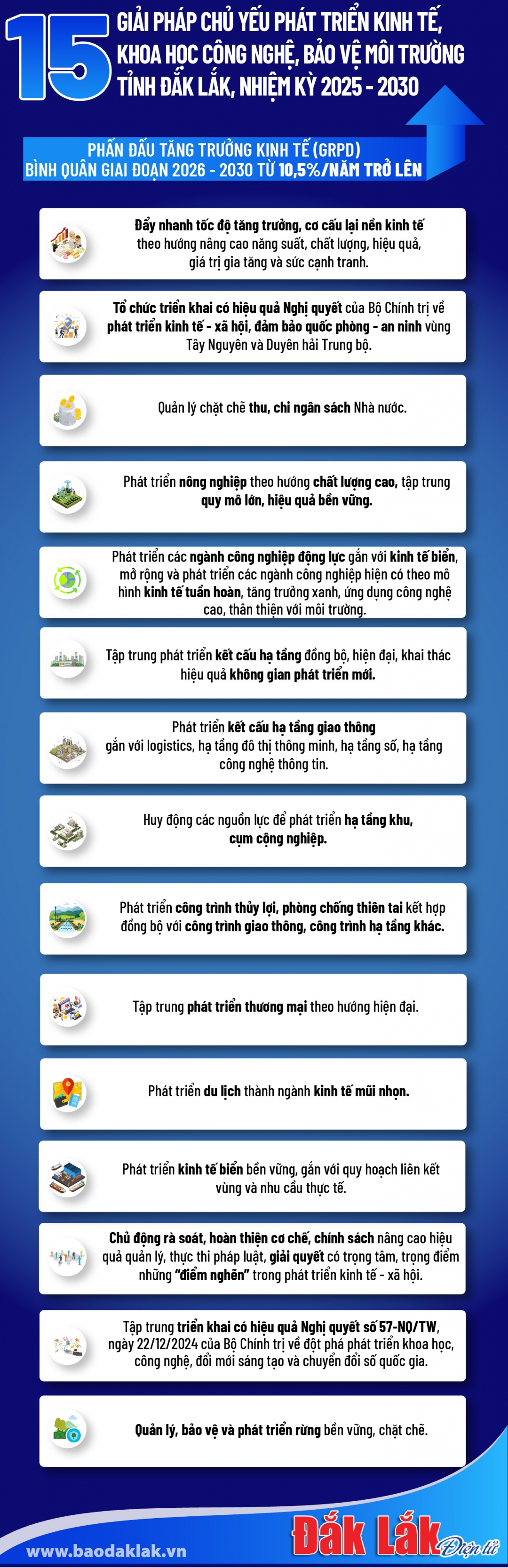 (Inforaphic) 15 giải pháp chủ yếu phát triển kinh tế, khoa học công nghệ, bảo vệ môi trường tỉnh Đắk Lắk nhiệm kỳ 2025-2030