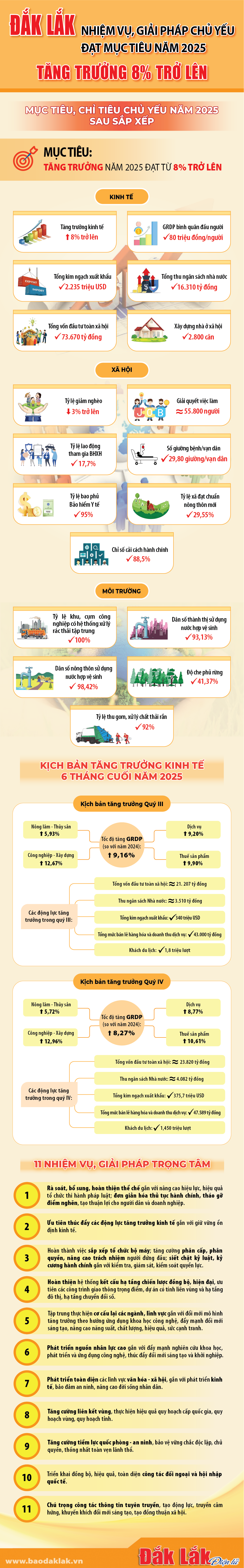 UBND tỉnh Đắk Lắk vừa ban hành Chương trình hành động triển khai thực hiện các nhiệm vụ, giải pháp chủ yếu thúc đẩy phát triển kinh tế - xã hội, bảo đảm quốc phòng - an ninh của tỉnh (sau sáp nhập) với mục tiêu tăng trưởng năm 2025 đạt 8% trở lên.