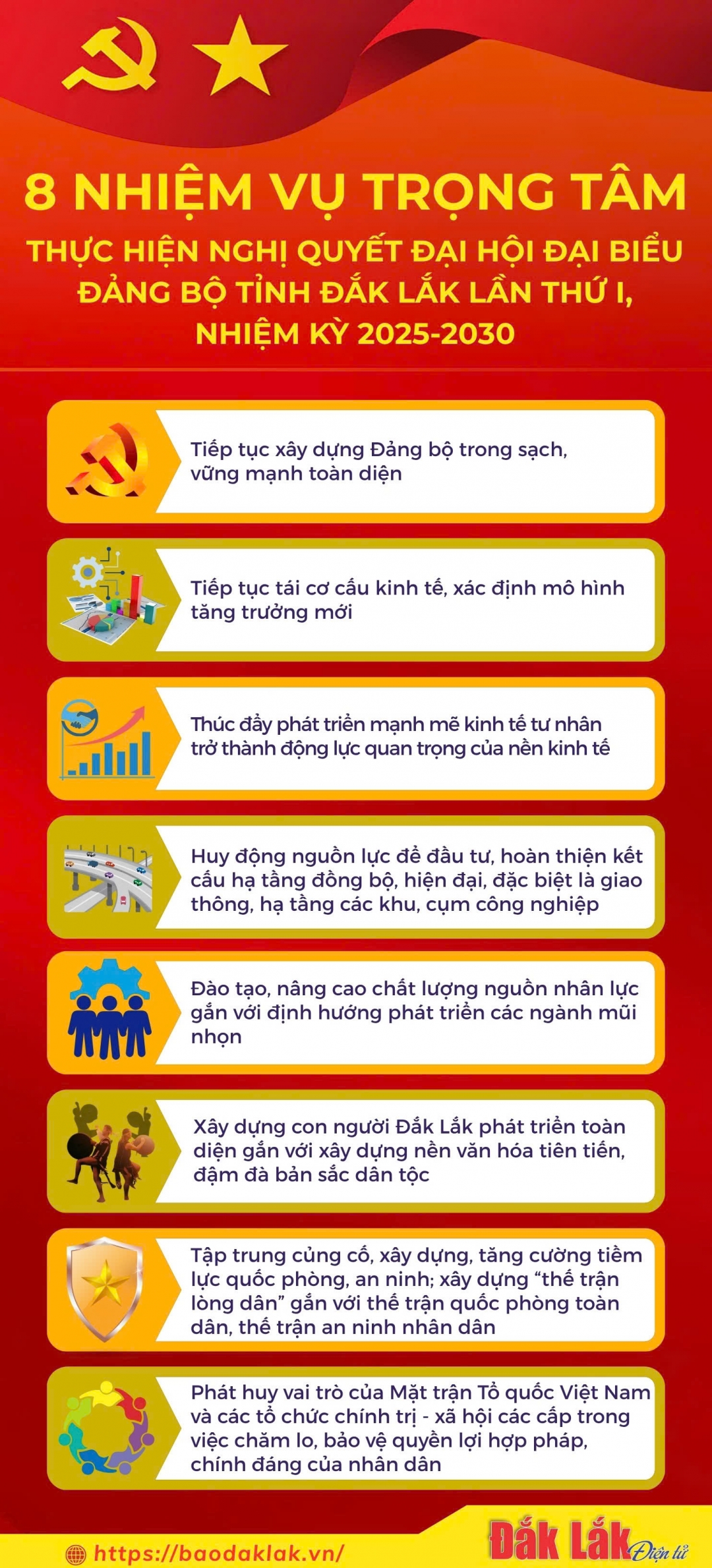 (Infographic) 8 nhiệm vụ trọng tâm thực hiện Nghị quyết Đại hội đại biểu Đảng bộ tỉnh Đắk Lắk nhiệm kỳ 2025-2030