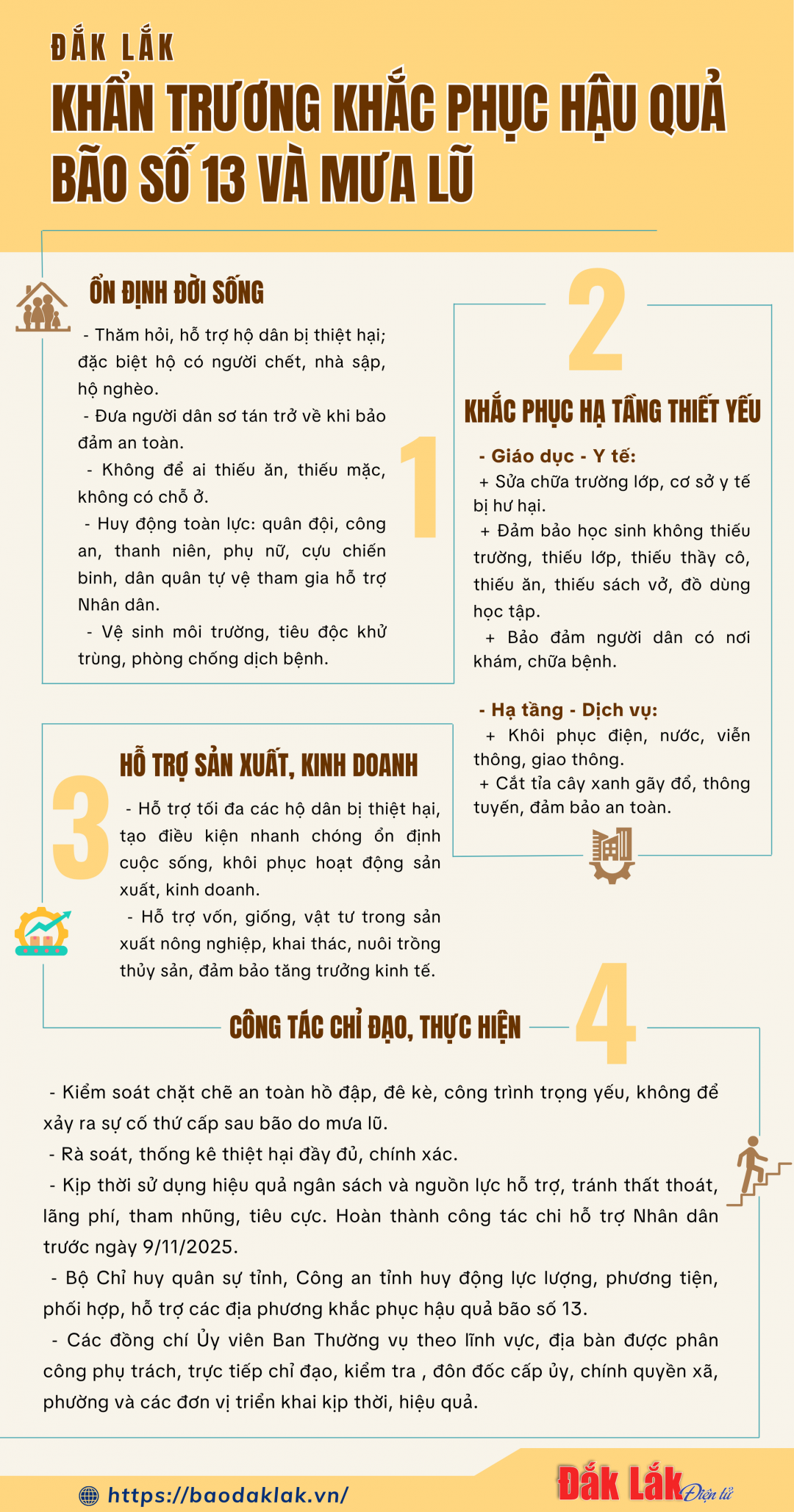 Trước thiệt hại nặng nề do bão số 13 (Kalmaegi) gây ra, ngày 7/11/2025, Ban Thường vụ Tỉnh ủy Đắk Lắk đã ban hành công văn số181-CV/TU về việc khẩn trương khắc phục hậu quả bão số 13 và mưa lũ trên địa bàn tỉnh; trong đó yêu cầu các cấp, các ngành, địa phương khẩn trương huy động mọi lực lượng, tập trung khắc phục hậu quả, bảo đảm không để người dân nào thiếu ăn, thiếu mặc, không có chỗ ở, sớm ổn định đời sống và khôi phục sản xuất.