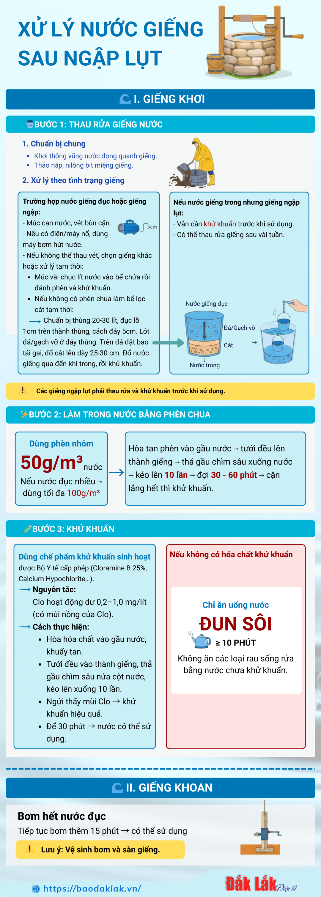Trong bão lụt, nước ngập cuốn theo rác thải, chất thải từ cống rãnh, nhà vệ sinh, xác súc vật, chuồng trại, côn trùng, cây cối… , khiến nước bị ô nhiễm nặng. Theo khuyến cáo của Bộ Y tế, ngay khi nước rút, cần thực hiện các biện pháp xử lý nước để tránh ảnh hưởng đến sức khỏe.
