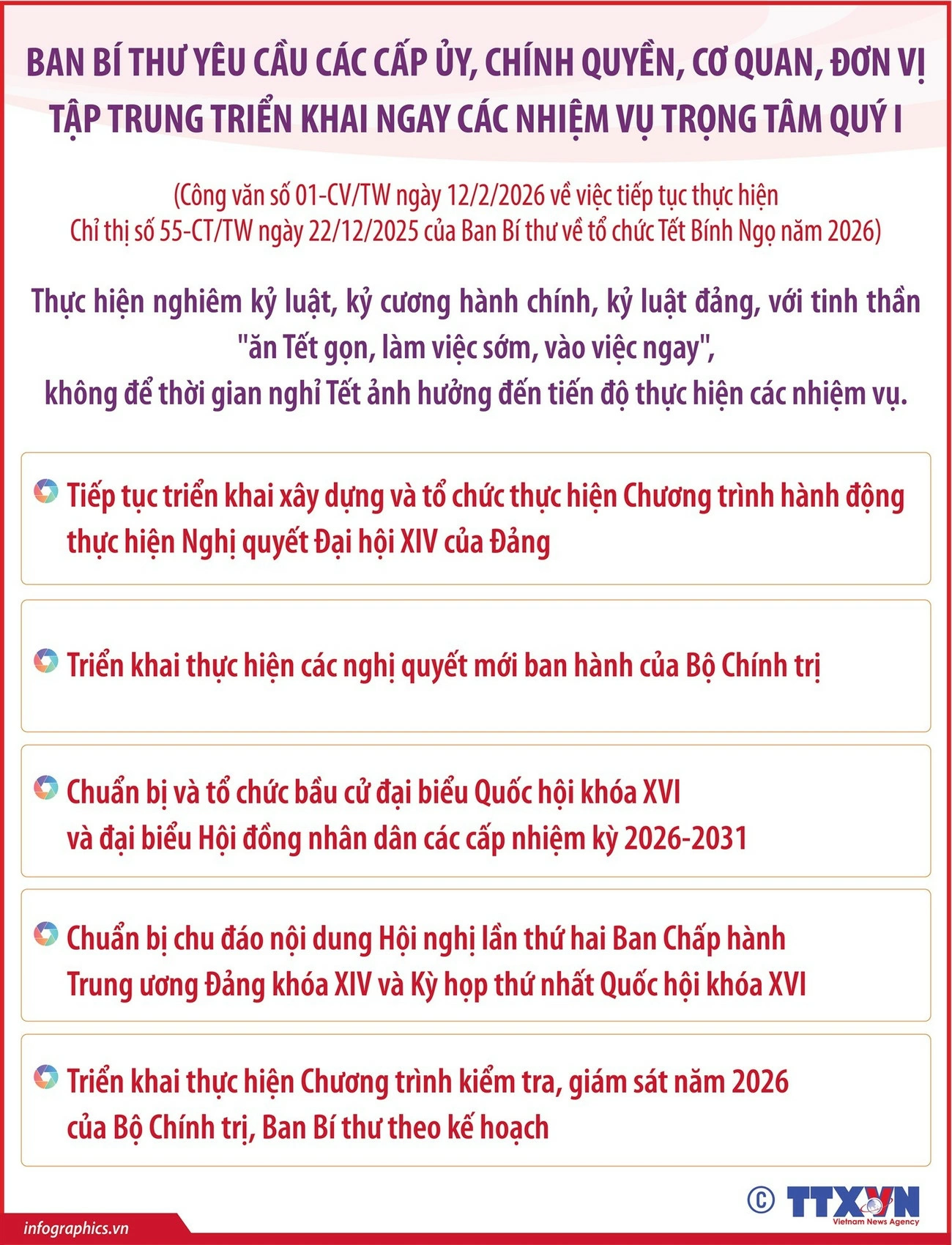 Một trong những nội dung quan trọng trong Công văn số 01-CV/TW ngày 12/2/2026 của Ban Bí thư nêu rõ: Thực hiện nghiêm kỷ luật, kỷ cương hành chính, kỷ luật đảng, với tinh thần "ăn Tết gọn, làm việc sớm, vào việc ngay," không để thời gian nghỉ Tết ảnh hưởng đến tiến độ thực hiện các nhiệm vụ.