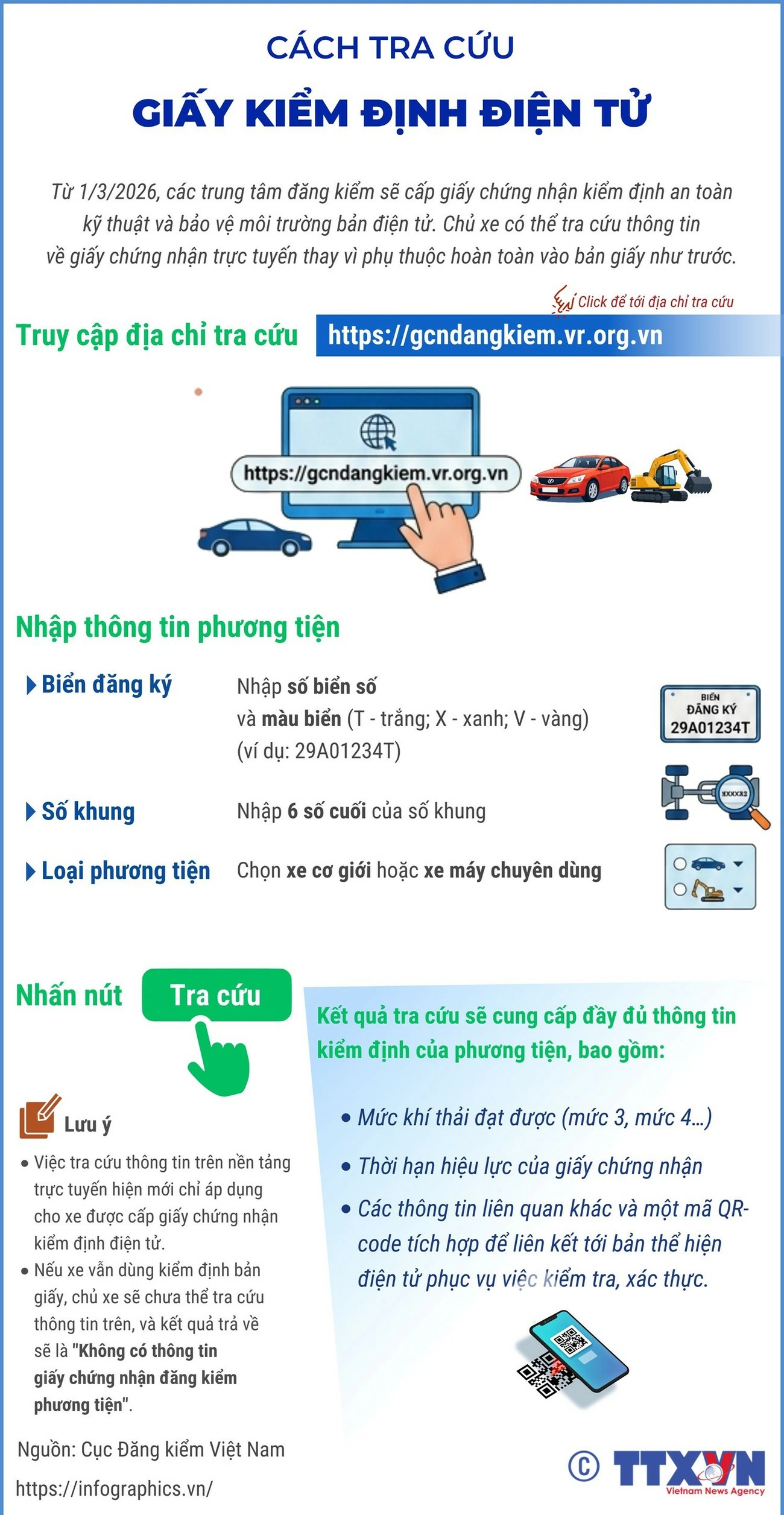 Để tra cứu, chủ xe truy cập website của Cục Đăng kiểm Việt Nam tại địa chỉ gcndangkiem.vr.org.vn.