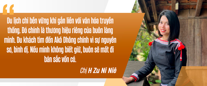 Năm 2023, buôn Akǒ Dhông được công nhận là buôn du lịch cộng đồng đầu tiên của tỉnh Đắk Lắk. Xác định giới thiệu văn hóa không chỉ để khách hiểu, mà còn để chính người trẻ ý thức sâu hơn về giá trị di sản cha ông để lại, H Zu Ni xung phong tham gia Ban Quản lý du lịch cộng đồng, trở thành “hướng dẫn viên” không chuyên. Mỗi khi có đoàn khách đến tham quan, chị say sưa kể chuyện về không gian nhà dài, văn hóa cồng chiêng, những bữa cơm dân dã cùng rượu cần nồng nàn.