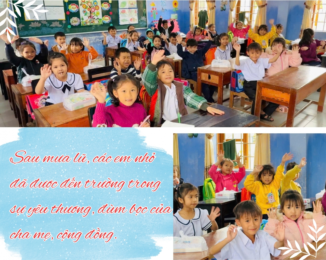 Không chỉ ở thôn xóm, tại các điểm trường thuộc Hòa Tâm, Tây Hòa, Đông Hòa, màu áo xanh của các chiến sĩ Sư đoàn 315, Sư đoàn 307 (Quân khu 5), Sư đoàn 10 (Quân đoàn 3), Trung đoàn 143… có mặt khắp nơi. Trong lớp học bề bộn sau lũ, các chiến sĩ kiên nhẫn phân loại sách vở, tài liệu, rửa sạch từng bộ đồ dùng học tập còn có thể cứu vãn.