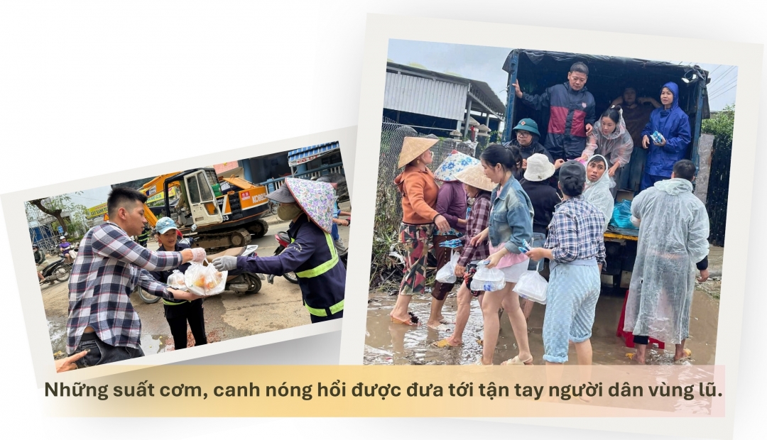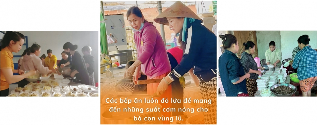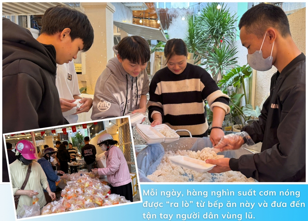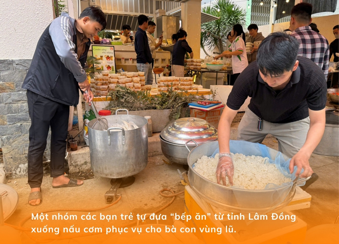 Không ai kêu gọi, cũng chẳng cần phân công, từng nhóm thanh niên, phụ nữ, đoàn viên lại tự nguyện tụ họp, vo gạo, nhặt rau, nhóm lửa, nấu từng nồi cơm nóng hổi để gửi đến bà con đang bị nước lũ bủa vây.