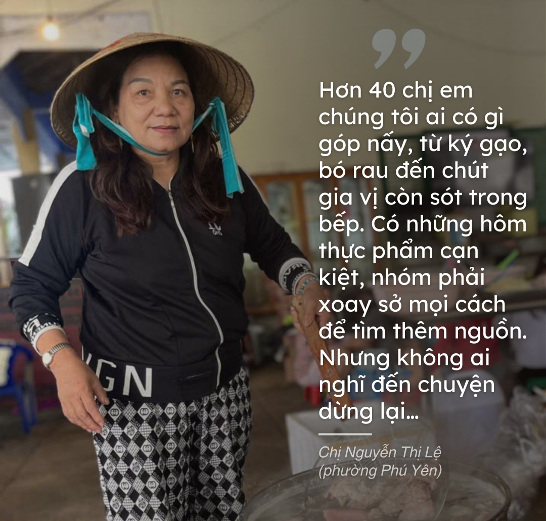Không chỉ ở phường Phú Yên, những bếp ăn yêu thương cũng đồng loạt sáng lên ở các xã, phường Phú Mỡ, Sơn Thành, Bình Kiến, Tuy Hòa… Tại thôn Kỳ Lộ, dù còn nhiều thiếu thốn sau bão số 13, các má, các chị vẫn nấu 500 phần cơm gửi đến Long Hòa, Tân Bình, Tân Long của xã Đồng Xuân. Ở Sơn Thành, hàng chục bếp ăn của người dân, hội phụ nữ xã đã được hình thành và duy trì nhiều ngày liền sau lũ.