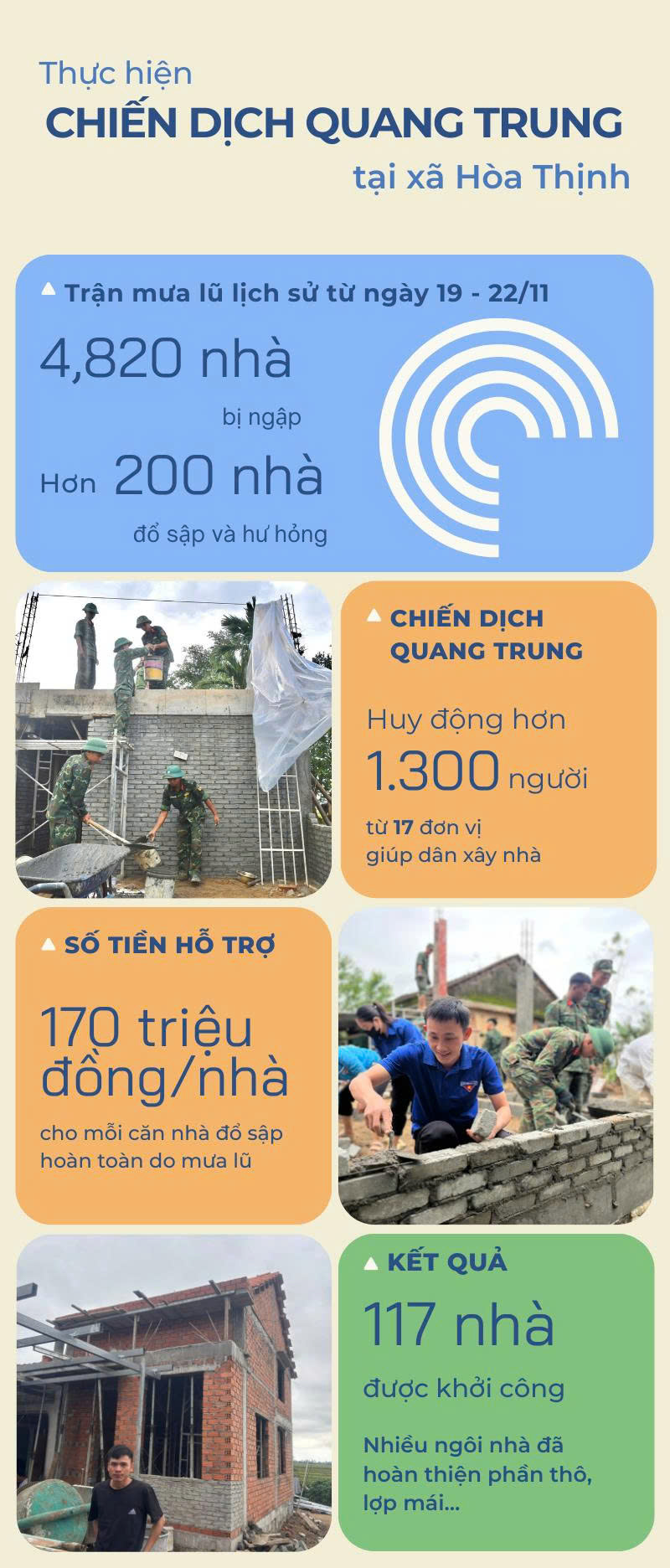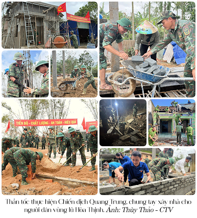Cùng với nhân dân, cấp ủy, chính quyền xã bám sát cơ sở, kịp thời chỉ đạo công tác cứu trợ, rà soát thiệt hại, đề xuất hỗ trợ khẩn cấp. Đặc biệt, hưởng ứng chủ trương của Chính phủ, Chiến dịch Quang Trung được triển khai với sự tham gia của quân đội, công an và các lực lượng chức năng. Chỉ sau thời gian ngắn, nhiều ngôi nhà mới đã được xây dựng nhanh chóng, từng bước giúp người dân vùng lũ có nơi ở an toàn, ổn định trước Tết Nguyên đán.