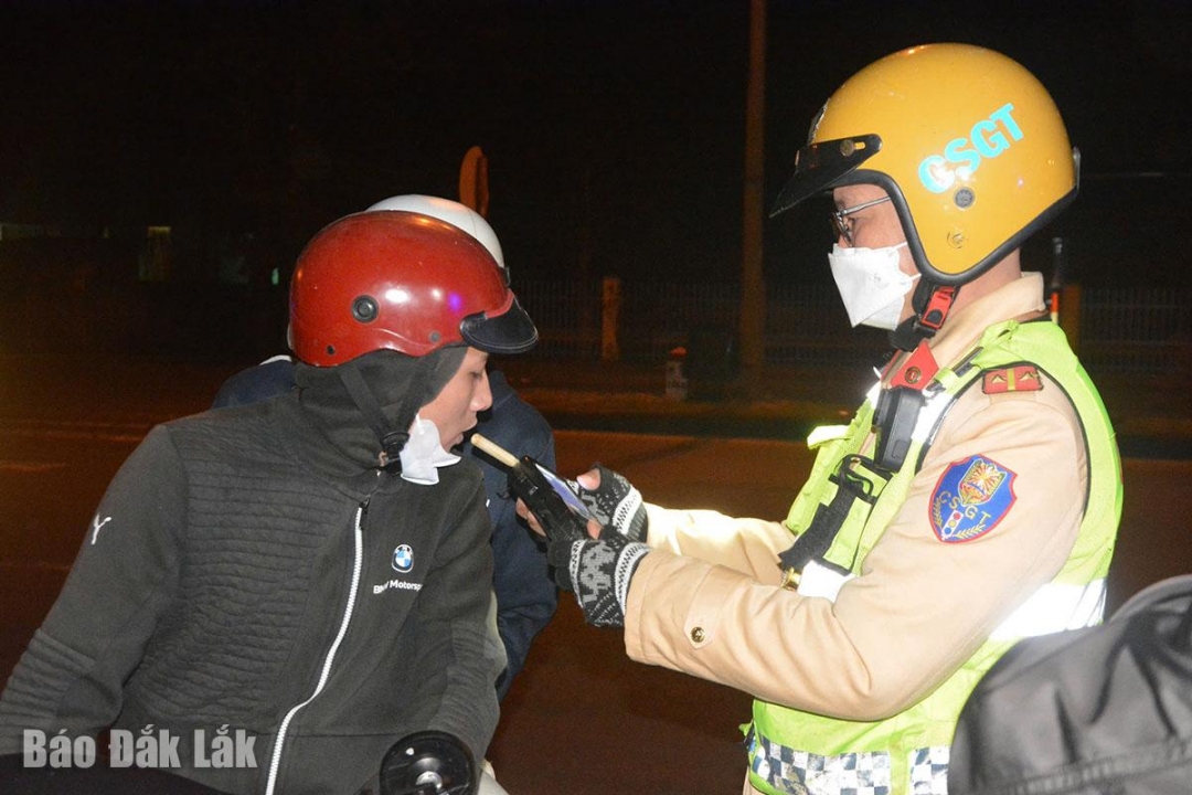 Cán bộ Phòng Cảnh sát giao thông (Công an tỉnh Đắk Lắk) kiểm tra nồng độ cồn người điều khiển phương tiện. |