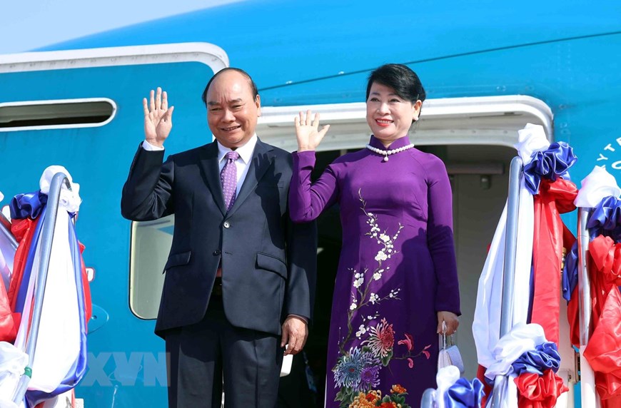 | Chủ tịch nước Nguyễn Xuân Phúc và Phu nhân tại Sân bay quốc tế Wattay, thủ đô Vientiane. (Ảnh: TTXVN) |
