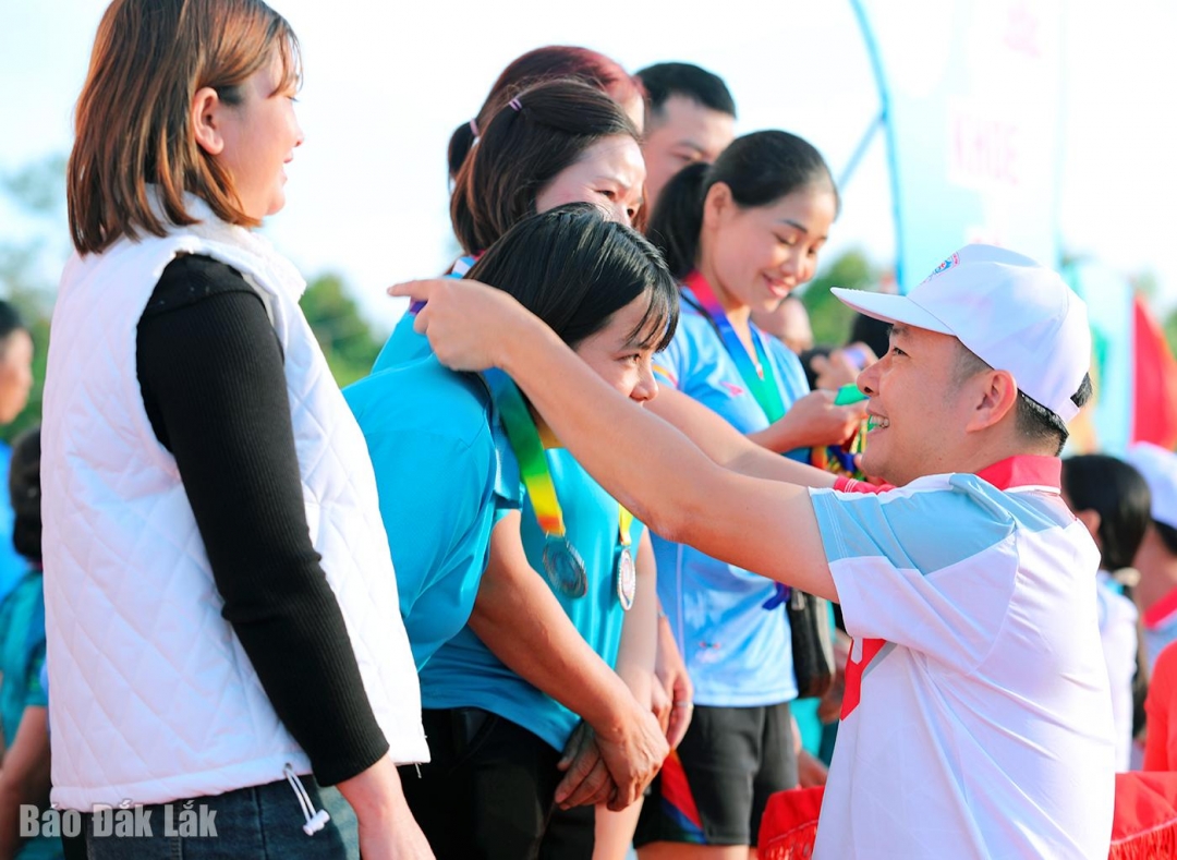 | Ông Phan Tiến Thành, Phó Bí thư Đảng ủy, Chủ tịch UBND xã, Trưởng Ban chỉ đạo Đại hội TDTT xã Phú Xuân lần thứ I, năm 2025 - 2026 trao Huy chương cho các đội đạt thành tích cao ở môn Kéo co. |