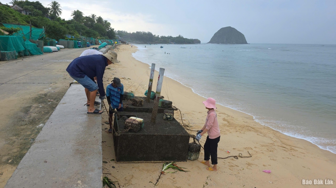 | Ngư dân khu vực phía Đông tỉnh Đắk Lắk kiểm tra lồng bè nuôi trồng thủy sản trước thời điểm bão đổ bộ. Ảnh: Tuyết Hương |