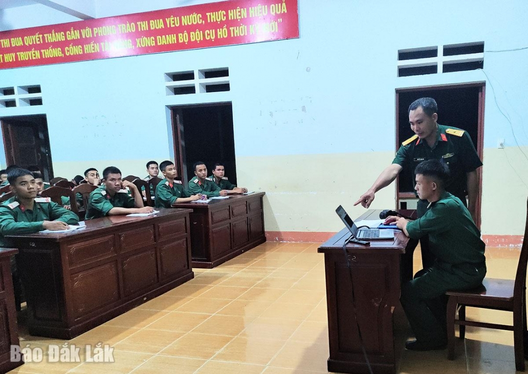 | Cán bộ Ban Chỉ huy phòng thủ khu vực 3 - Ea Súp hướng dẫn chiến sĩ Đại đội Bộ binh 2 học các nội dung “Bình dân học vụ số”. |
