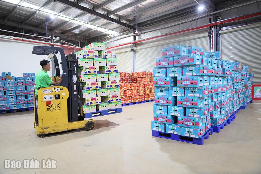 | Trái sầu riêng được đóng gói xuất khẩu tại Nhà máy chế biến trái cây xuất khẩu Chánh Thu Đắk Lắk. |
