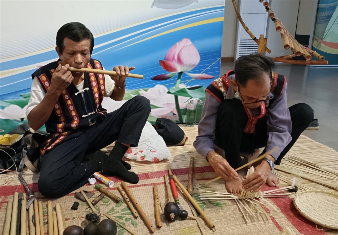 | Nghệ nhân truyền dạy đánh chiêng Jhô của người Êđê Bih cho các học viên |