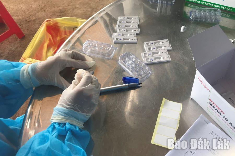 | Nhân viên y tế lấy mẫu xét nghiệm SARS-CoV-2 cho người dân xã Cư Êbur. |