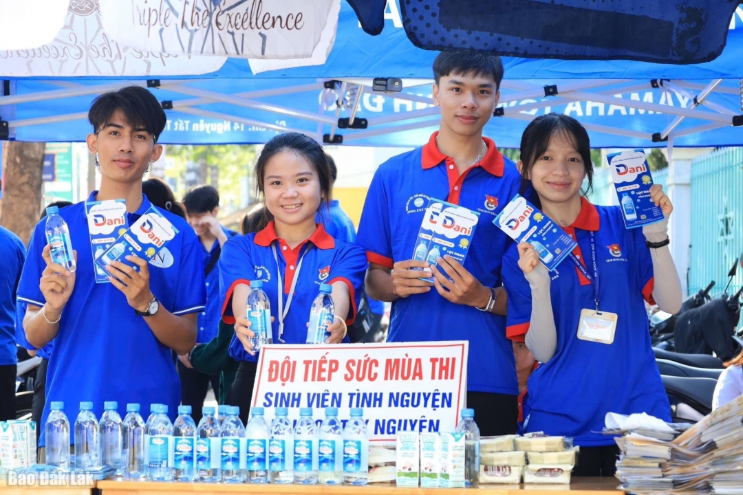 | Lực lượng thanh niên tình nguyện chuẩn bị các suất ăn để phát cho thí sinh và người nhà tại điểm thi Trường THPT Nguyễn Tất Thành (huyện M'Drắk). |